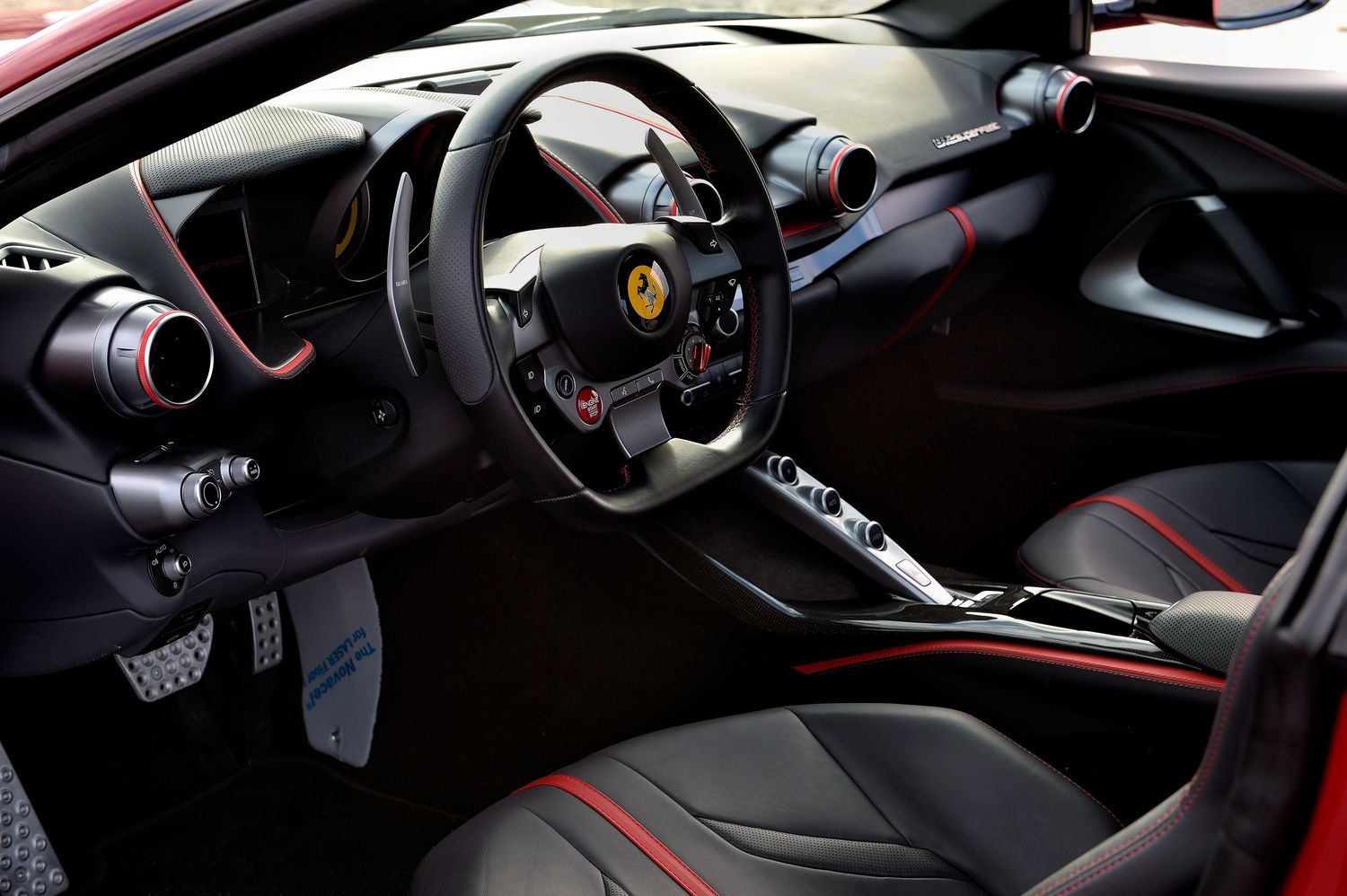 812スーパーファストはかなりでかい。2人乗りだというのに、全長は4657mm。全幅は1971mmと2m近くもあり、全高は1276mmとグッと低い。家族5人が乗れるトヨタ・カローラよりはるかにでっかいのに、このクルマには2人しか乗れない。なんだか悪いことをしているような気分になるのは、812が社会の常識みたいなものから逸脱した存在だからであるに違いない。