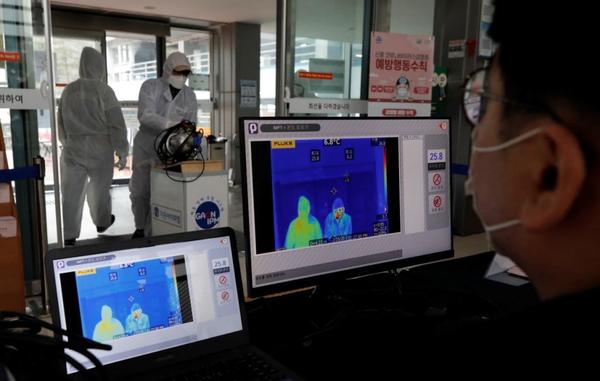企業の入り口には出社する人の体温を測る装置が据えられた(2月25日、韓国の首都ソウルで、写真:AP/アフロ)