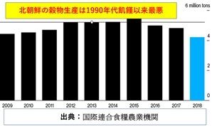 北朝鮮は米国などによる制裁に加え、1990年代の飢餓以来、穀物生産が最悪の落ち込みを見せており、約1000万人(人口2489万人の約40%)が深刻な食料不足に陥っていると見られる。