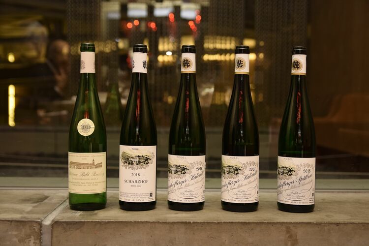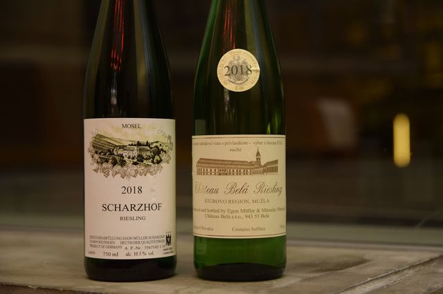 右がシャトー・ベラ。以前、このワイナリーがどんなワインを造っていたかは誰もわからないので、エゴン・ミュラーが0からつくりあげた。左はシャルツホーフ。Q.b.Aという分類にはいり、シャルツホーフベルクの近隣でエゴン・ミュラーが持つ畑のブドウを基本的には使う。シャルツホーフベルガーが特級畑なら、シャルツホーフベルクは一級といったところ。中辛口のリースリング。