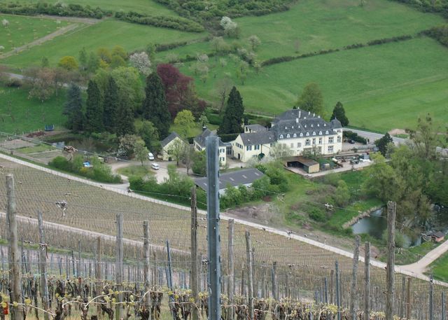 エゴン・ミュラーのワイナリーを丘のブドウ畑から望む