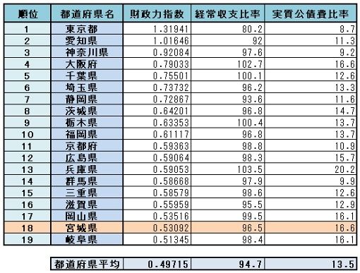 確かに、東北の自治体は宮城県を除いては、もともと財政が豊かではないところが多いのが現状です。自治体の財政力を測る指標はいくつかありますが、以下の表は2007(平成19)年度の都道府県の財政力を、「財政力指数」を基準としてランキングしたものです。
