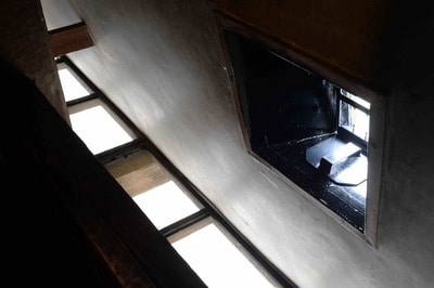 写真4:内側から見た石落と狭間。遠くの敵は狭間から撃ち、足元にもぐられたら石落から撃つようになっている。真下に来たら石を落としてもいいんだけどね。撮影/西股 総生