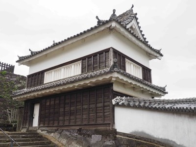 写真5:臼杵(うすき)城(大分県)の畳櫓。軒回りや窓の格子が、防火対策として漆喰で塗り込められている。入り口も防火扉