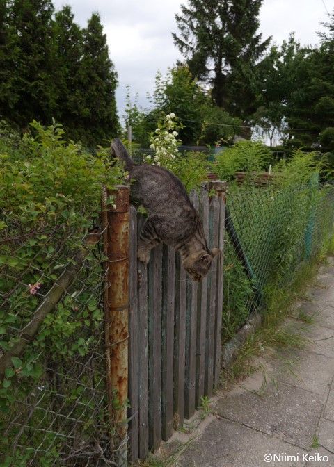 住宅地を散策していると、トラ猫くんがフェンスの扉を乗り越えて、目の前に来ました。
