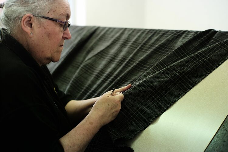 織りあがった生地にわずかに残る糸のカスを取り、ほつれを直す職人。よい生地は検品体制も万全だ