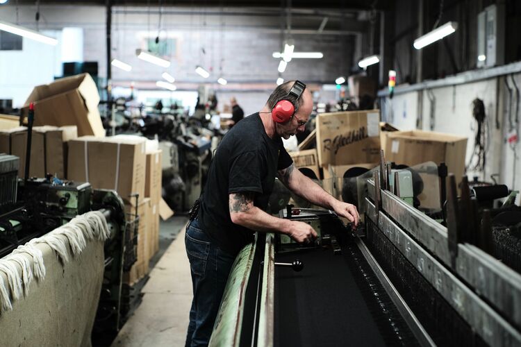 〝FOX〟の工場。織機の稼動音が鳴り響くため、職人たちは皆ヘッドフォンを装着している