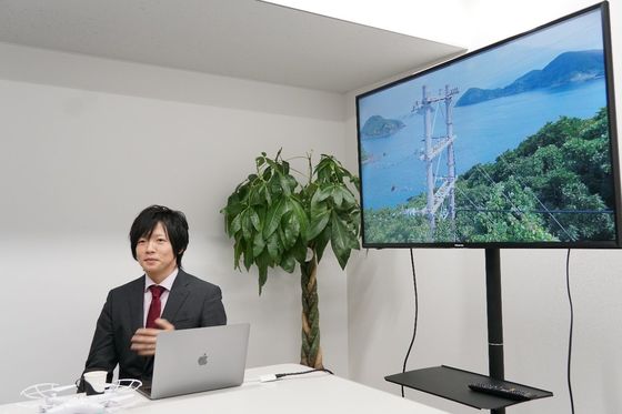 長崎県平戸市の沿岸から離島にドローンを飛ばし、配電設備(電柱や電線等)を点検。「見える範囲の離島までならドローンを飛ばせます」(原さん)