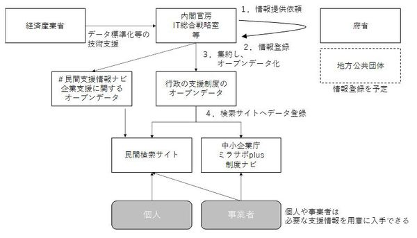 これを受け、内閣官房情報通信技術総合戦略室および総務省、経済産業省は、各府省が提供する支援制度情報のデータをオープン化した。利用者視点で標準化したデータを、国や地方公共団体などの組織の枠を超えて一ヵ所に集約し、一元的に情報が入手できるシステムを構築。システム内に現在登録されているのは、政府で集約した支援制度が中心となっているが、情報収集体制が整い次第、地方公共団体による制度情報についてもオープンデータ化を進め、順次登録を行う方針だ。