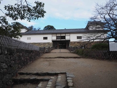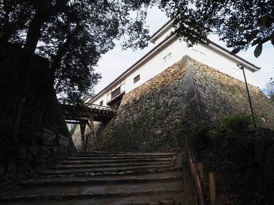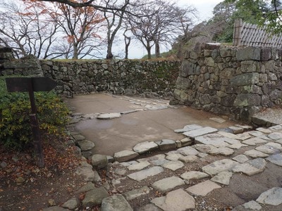 写真2:彦根城の天秤櫓を見上げたところ。手前の坂道を登って堀底を通り抜けなければ、次のステージ(鐘の丸)には進めない。