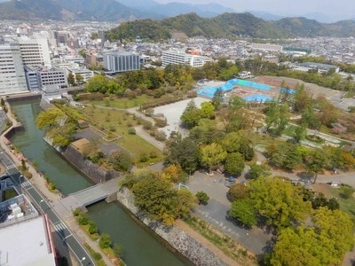 写真2:平地に築かれた駿府城。後ろに見える山の上には、戦国時代に今川氏が築いた賤機山(しずはたやま)城という山城がある。