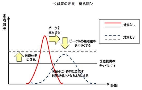 わが国でもオーバーシュートの危機に直面しています。政府が発表した「新型インフルエンザ等対策政府行動計画」(内閣官房新型インフルエンザ等対策室)には次の〈対策の効果 概念図〉が紹介されています。