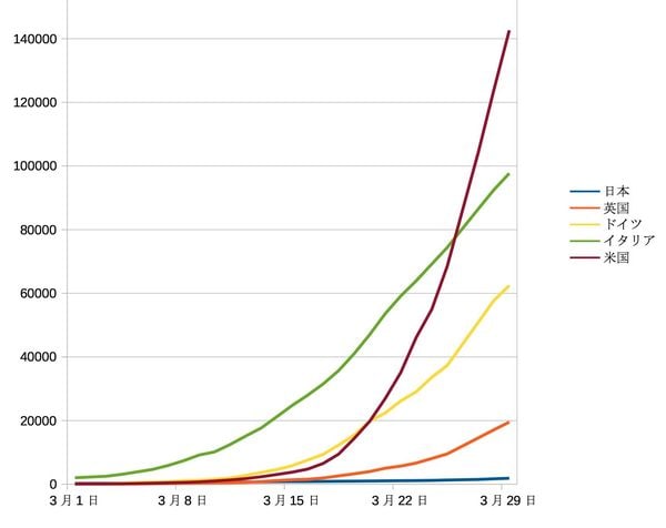 米軍の主要駐留国(韓国を除く)での感染確認者数(Worldometerのデータを基に作製)