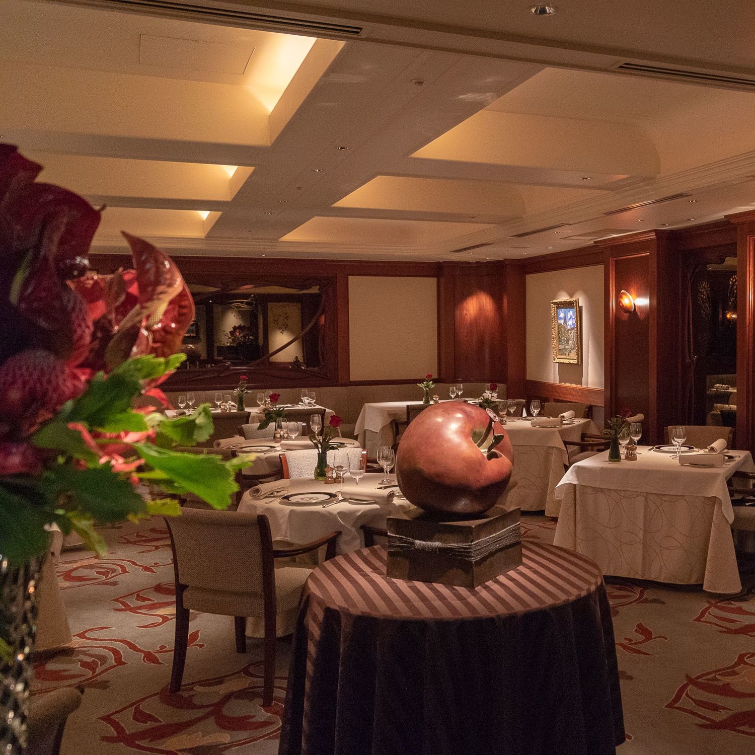 名画に囲まれた空間に、広いテーブルと椅子をゆったりと配置したダイニング。全60席。