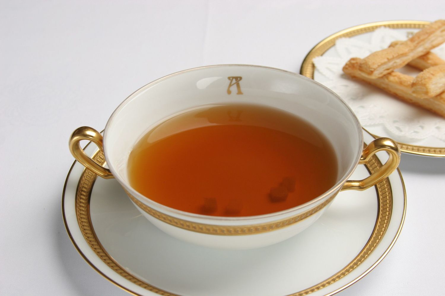 「小笠原産母島の青海亀のコンソメスープ シェリー酒風味」は、アラカルトで4,000円(小は3,000円)。6,000円のランチコースにこのスープを追加すると、前菜「旬の海の幸 タルタル仕立て」に続いて、金縁のカップに注いだスープが運ばれた。前菜は帆立などの貝の清らかな甘みがキャビアの塩気で引き立ち、そこにピンクグレープフルーツの香りと酸味、ほろ苦さが加わって、エレガントそのもの。その磨き抜かれた美しさは「青海亀のコンソメスープ」にも通底しており、スープにはさらに凛とした旨味があった。そして少し飲んだだけで体が温まり、活力が出る。このスープ、「アピシウス」ではバブル期より前から作り続けられているという。誕生のきっかけを岩元学料理長に尋ねると、こんなエピソードを教えてくれた。