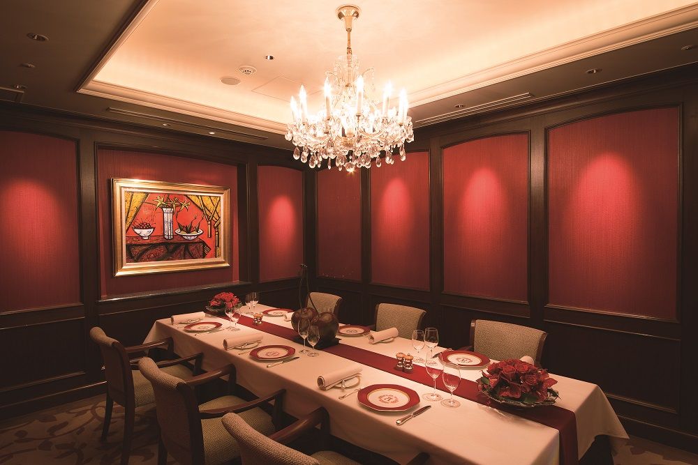 深いボルドーの壁にビュッフェの絵が飾られた個室「サロンガーネット」(4名~8名)。個室料¥12,000。