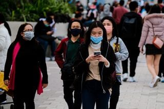 レバノン・ベイルートのラフィク・ハリリ空港で、サウジアラビアで足止めされていたレバノン人乗客を運ぶバスの見張りをするレバノン軍兵士たち。新型コロナウイルスの拡散を防ぐために3週間近く前からベイルートの国際空港は使用が制限されている(2020年4月5日、写真:AP/アフロ)