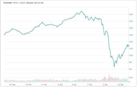 新型コロナウイルス禍の拡大懸念から日米欧の主要株式市場が急落すると、原油・エネルギー関連銘柄の比重が大きいRTS指数も18日には832ポイントと1月の年初来高値からほぼ半分の株価となった。