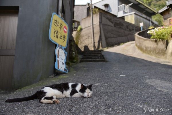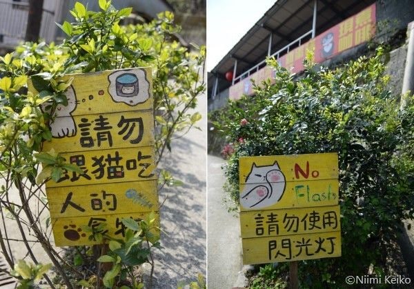 猫村に入る人に向けて、注意書きの看板があります。「人の食べ物は、与えないで」「写真を撮るときに、フラッシュを使用しないで」「猫をさわる前に、手を洗いましょう」など。これらの写真は少し古いもので、いまは別の看板になっています。