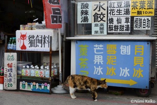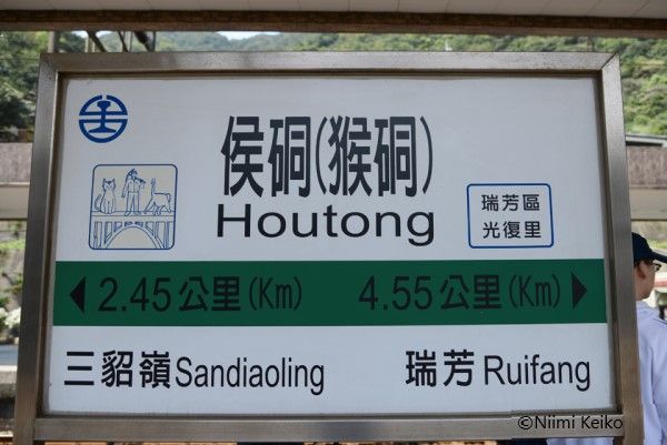 ホームにある駅名板です。駅名の左には猫、炭鉱夫、猿、鉄橋が描かれています。炭鉱でにぎわう以前は、猿たちが洞穴で暮らしていたことから、侯硐(「侯」「猴」は猿のこと)という村名が付きました。猫のイラストが加わっているのは、猫村として世界から認知されたという誇りを示しているようです。