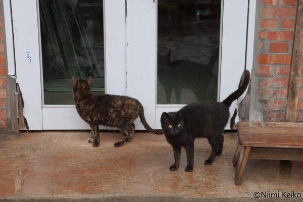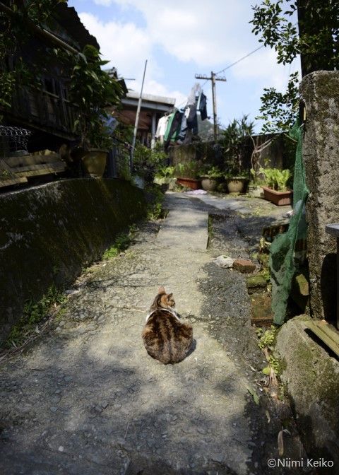 村の道を進むと、猫がたたずんでいました。なでられるのを待ちかまえているような背中です。