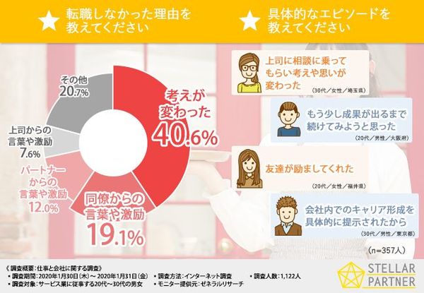 転職が当たり前になっている一方で、実際には「転職しなかった」人も32.6%存在する。「転職しなかった理由」を質問したところ、最も多かったのが「考えが変わった」で40.6%。次いで「同僚からの言葉や激励」が19.1%、「パートナーからの言葉や激励」が12%、「上司からの言葉や激励」が7.6%となった。