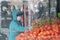 4月14日、ニューヨーク・クイーンズ区の青果売り場で買い物する女性。感染対策のため、近所への買い物にでも、多くの人がこのような重装備で出かけている(写真:AP/アフロ)