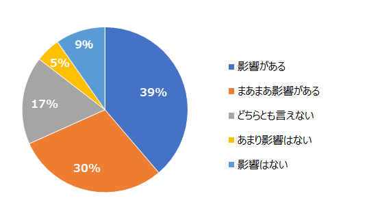 まず、「採用活動に関する影響の有無」については、「影響がある」が39%、「まあまあ影響がある」が30%となっており、これらを合計した「多少なりとも影響がある」(以下同じ)は69%と7割に上り、3月初旬に行った前回調査時よりさらに10ポイント増加となっている(図表1-1)。