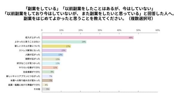 次に、副業をしてよかったことについて聞くと、約半数の48%が「年収が上った」と回答。このほか、ポジティブな回答としては、「新しいスキルが身についた」が17%、「ストレス解消になった」が15%という結果だった。一方、「よかったと思うことがない」が24%いることから、副業に対してネガティブなイメージをもつ人も一定数いるようだ。