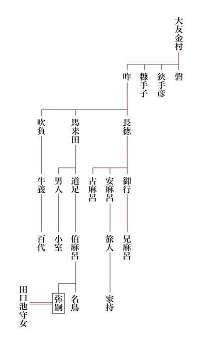 弥嗣は、天平宝字五年(七六一)生まれ。妻は田口池守(たぐちのいけもり)の女(むすめ)であるが、田口氏というのは蘇我(そが)氏の同族で、平安時代初期には、田口氏の女性(名は不詳)が橘清友(たちばなのきよとも/奈良麻呂(ならまろ)の男)の妻となり、延暦五年(七八六)に、後に嵯峨(さが)天皇の皇后となって仁明(にんみょう)天皇を産むことになる嘉智子(かちこ)を産んでいる。