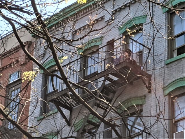 ニューヨークによくあるブラウン・ストーンのアパート。非常階段にはパソコンに向かい仕事をする住人が見える