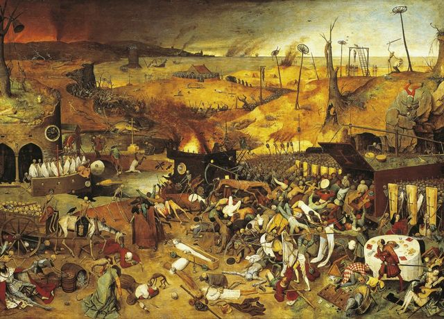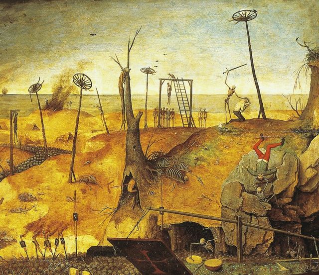 「死の勝利」というタイトルで知られるこの絵画は、1562年ごろに描かれた、とされていて、背景には、1348年から1420年にかけて断続的につづいた、ペストの流行があります。ペストは当時、人口4億5千万人程度だったという人類のうち、1億人近くを死に追いやったとされています。