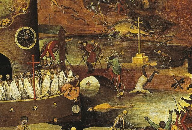 画面左下には権力者や赤子も差別なく死んでいく様が描かれている。都市は水辺に形成されるため、溺死体は、わりとありふれた死体で、見た目の面白さから人気があった