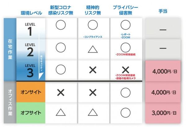 危険手当の支給対象者は、正社員を始め、契約社員、アルバイト、業務委託契約を含むオフィス作業が必要な全従業員。在宅作業を行う場合も、高いセキュリティ環境化での精神的負担が憂慮される場合は支給対象となる。期間については、原則在宅勤務体制を求める期間としているが、今後の情勢を見ながら決定する方針だ。