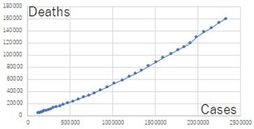 全世界データを見ると、なるほど真っすぐな傾きになっているので、コロナウイルスの「毒性」がこの傾きで評価できる・・・と、考えることができるかもしれません。