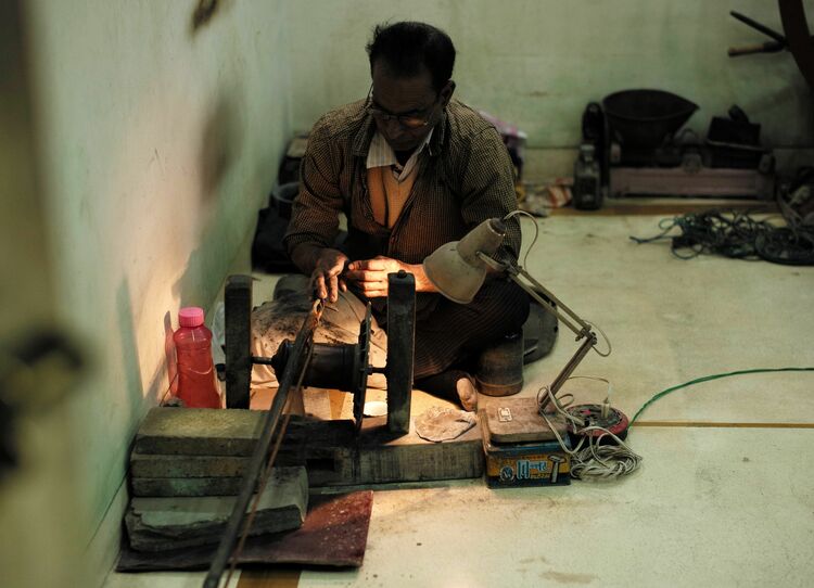木の棒を押し引きして動かす手動の研磨機を使い、シルバーを成形していく職人