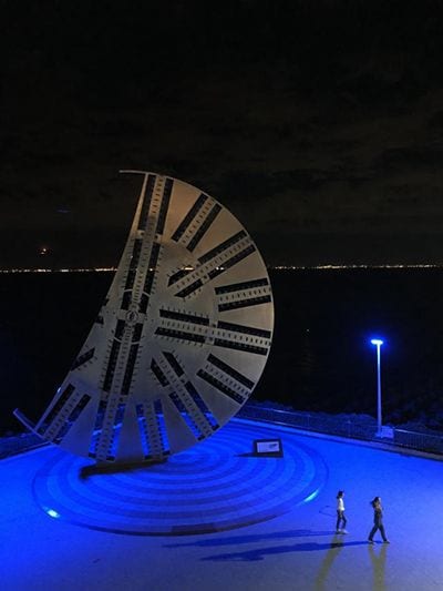 夜間にライトアップされた直径14.14mのカッターフェイス。そばを歩く人と比べると大きさがよくわかる
