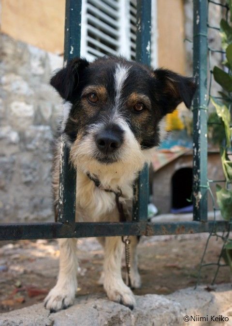 猫に話しかけていると、「くう〜ん」と小さな声がしました。振り向けば、優しい瞳をした犬が、シッポをふってこちらをじっと見ています。自分にも注目してほしいという顔をして何度も目をつぶり、手(前足)招きをしたので、頭を撫でてやりました。