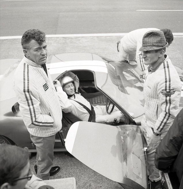 本物のシェルビーとマイルズ(左)。真ん中のドライバーはブルース・マクラーレン。1965年のル・マンで、マイルズはマクラーレンとのコンビで、7リッターのGT40で出場。予選で速さを見せたものの、決勝ではまたもや早々にメカニカル・トラブルで姿を消したPhoto:Ford