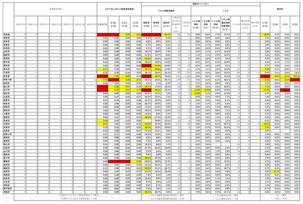 ・また、ICUの総数との比率もとった。上記の病床使用率は、病床を多く確保するほど低くなるが、他の疾患患者への影響なども考慮すべきと考えられるためだ。ここでは、日本集中医療医学会が、コロナの重症患者を収容できる上限は「(ICU総数6500のうち)1000床に満たない」(4月1日)と表明していることも参考に、10%、20%と設定した。