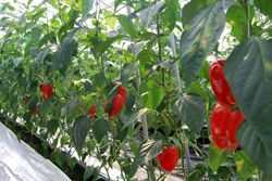 ビニールハウスの中、真冬でも日中は温度計が30度近くを指していた。目に飛び込んでくるのは、赤と黄の2色。カラーピーマンは大きいものだと直径10センチ、重さは180グラムもある。農業初心者が作ったとは思えないほど、色鮮やかな実が並んでいる。