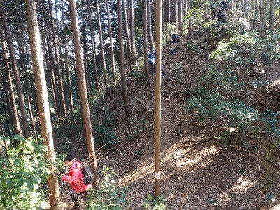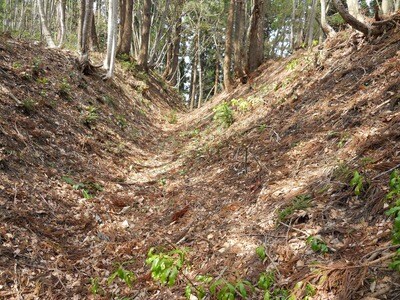 そうそう、戦国の土の城特有のアイテムとしては、竪堀(たてぼり)というものもあります。これは、斜面を縦に下ってゆく空堀です。堀切・切岸・竪堀などは、言葉で説明しただけでは、ピンとこないかもしれませんね。でも、実物を目にすれば「ははあ、なるほど、これか」と納得できますよ。