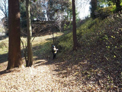 写真4:埼玉県・中城(なかじょう)の土塁。左手が城内で、右下には空堀が見えている。曲輪の縁に沿って土塁がめぐっているのがわかるかな?
