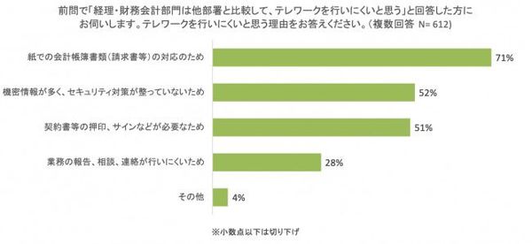 続いて、経理部門がテレワークを行いにくいと思う理由を尋ねると、「請求書など、紙の会計帳簿書類対応のため」が71%と最多となった。このほか、機密情報の取り扱いが多いことから「セキュリティ面」での懸念も上位に入っている。