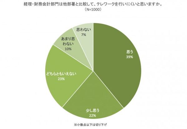 また、企業の経理部門は他の部署と比べてテレワークを実施しにくいか聞いたところ、「そう思う」が39%と最多回答となった。「少し思う」の22%と合わせると、61%の人が困難だと感じていることがわかる。一方、「あまり思わない」は10%、「思わない」は7%となり、他部署との差はないとの回答はわずか17%となった。
