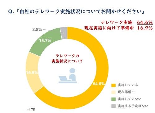 まず、RPAを導入している企業に対して、「テレワークの実施状況」を聞いた。その結果、64.6%が「実施している」、16.9%が「実施に向け準備中」と回答。6割以上がテレワークを実施しており、RPA導入企業のテレワーク実施率の高さがわかる。パソコンを日常的に利用することが多いほか、IT化への関心の高さが背景となり、スムーズにテレワークへ移行できたのではないだろうか。
