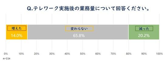 次に、テレワーク実施企業に対し「テレワーク実施前後での業務量の変化」について聞いた。最も多い回答が「変わらない」の65.8%で、テレワーク中でもオフィス勤務とほぼ同じ業務量である人が多いという実態が判明した。一方で「増えた」との回答が14%、「減った」が20.2%となり、担当業務による変動や差も見られた。