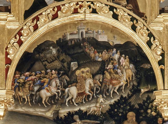 この絵画のように、一枚の絵のなかに、複数の時間が描かれている絵画、というのは、絵画のなかで、そんなに珍しいものではありません。今回、話題にしたいのは、この『貢の銭』とほぼ同時代、1423年にジェンティーレ・ダ・ファブリアーノという、これまたイタリアの画家が描いた『東方の三賢者の礼拝』という絵画です。
