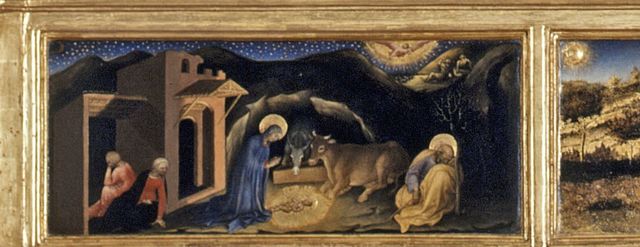 この絵は、祭壇に飾られる絵で、そういう作品には、下に、漫画のコマのような板絵がはめ込まれていることがある。これをプレデッラというのだけれど、この作品はプレデッラを説明するときにも引用されがち。ここにはイエス・キリストの幼年期の物語が描かれていて、東方の三賢者の物語を補足している。