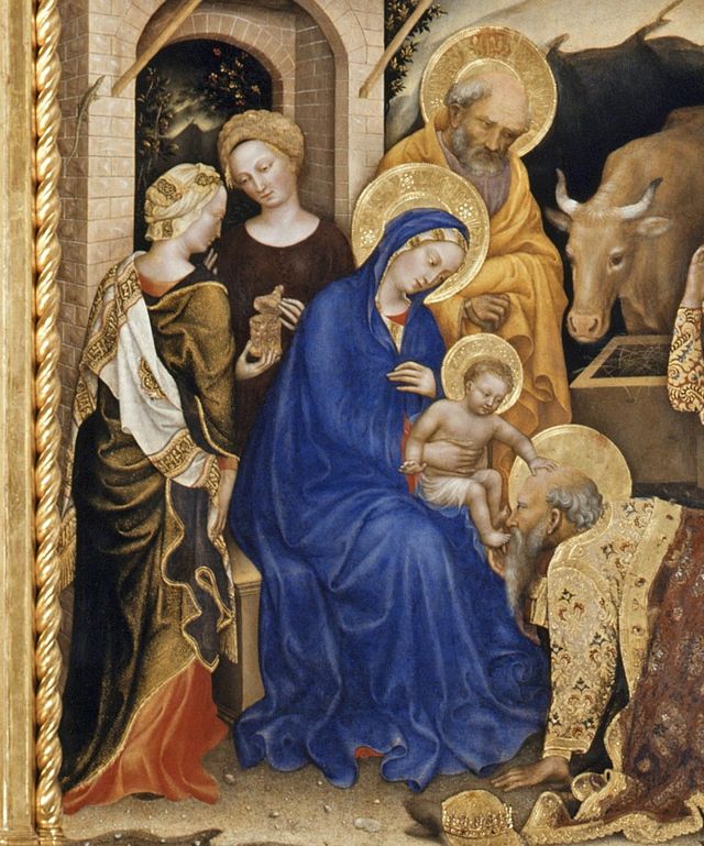 青いローブをまとっているのが聖母マリア、その奥が夫のヨセフ。ご注目いただきたいのは、マリアの背後にいる女性。ジェンティーレ・ダ・ファブリアーノは国際ゴシック様式の代表的な画家、とされているけれど、この女性の頭部や衣服の質感、ドレープの美しさなどは、国際ゴシック様式の真骨頂のような表現。体をひねって背中を見せていることで、画面の左端に三次元的な奥行きも与えている